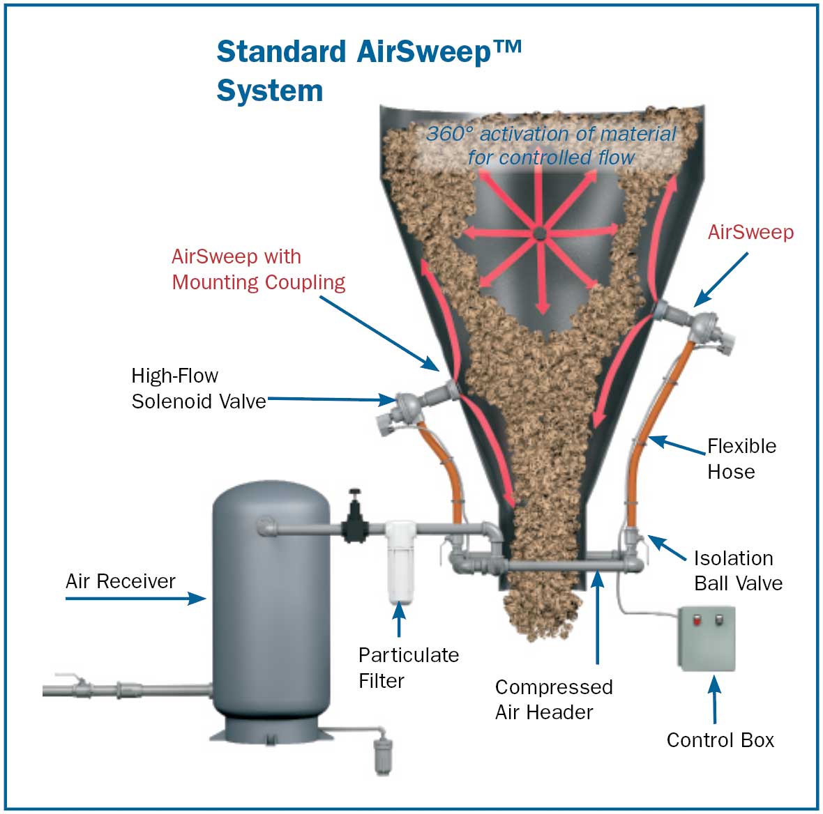 Airsweep eliminates bridging, ratholes and material build-up in storage vessels.