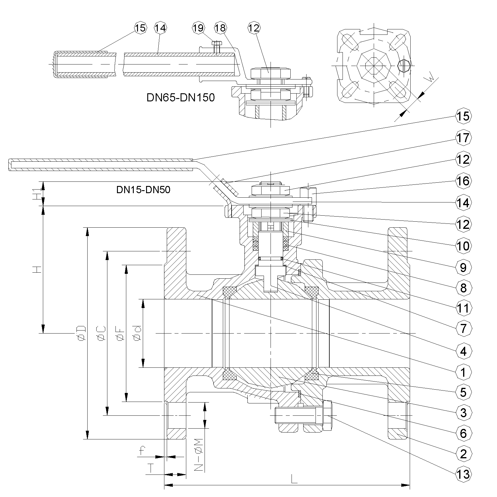 | SIZE | d | D | C | F | T | f | M | N | L | H | H1 | W | ISO-5211 | TORQUE (Nm) |